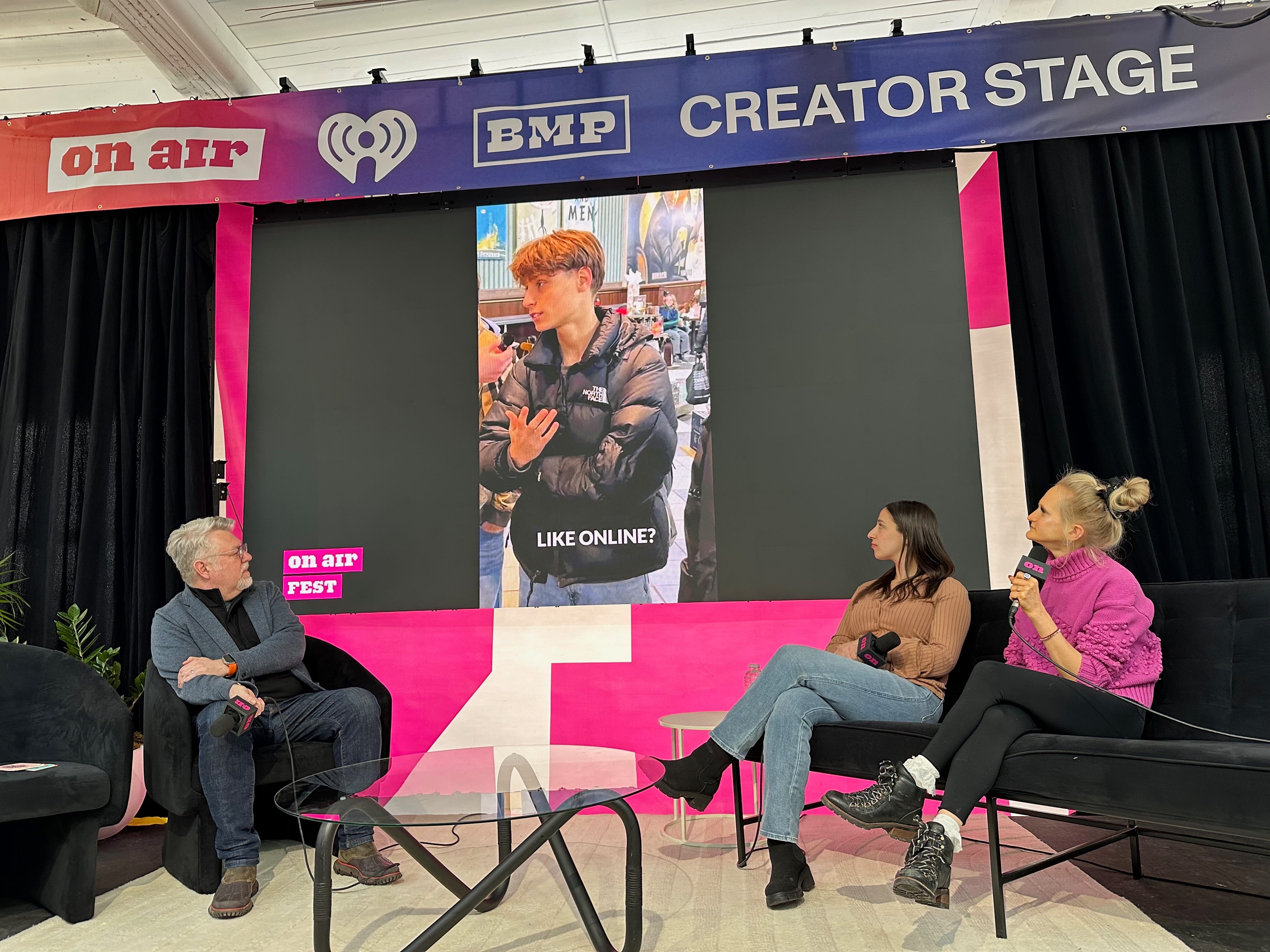 The event takes place at the Wythe Hotel in Williamsburg, Brooklyn. It’s a chic spot (that we feel like we know really well at this point after attending OAF for almost 10 years!) with aesthetic, vibey furniture, art installations in the bathrooms, two cozy and delish restaurants, and skyline views. Over the years, On Air Fest gets bigger and bigger while the venue stays the same size. BUT NOT THIS YEAR — in addition to the Wythe’s presentation rooms and stages, the festival expanded to the Arlo Hotel. And for the second year, there was a space dedicated to creators in a building right next door.
