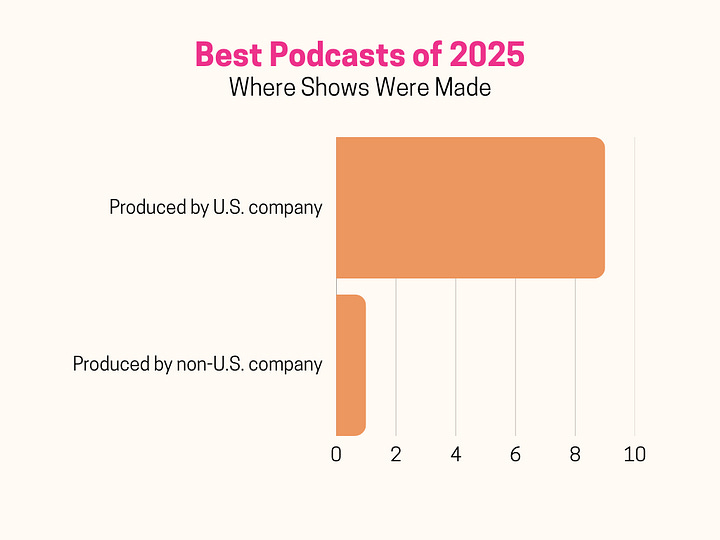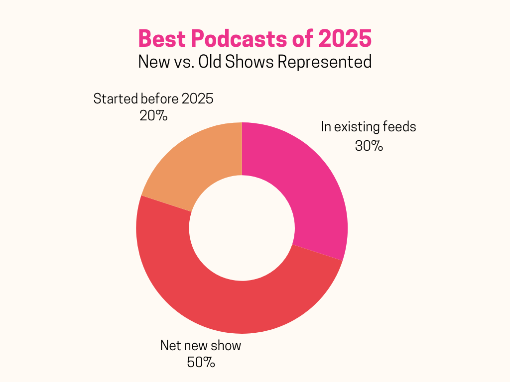 We make a distinction between editorially-curated best-of lists and top charts roundups. We didn’t include lists like “Spotify unveils top 50 shows of 2025,” because those are based on download numbers or follower counts.